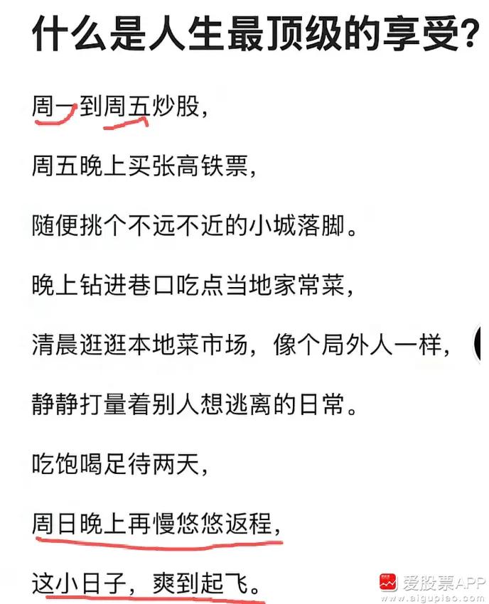 看到一个帖子说,人生最顶级的享受。周一到周五炒股,周末到处玩儿,所以好好炒股吧,等你能稳定赚钱了,小日子会爽的飞起的。