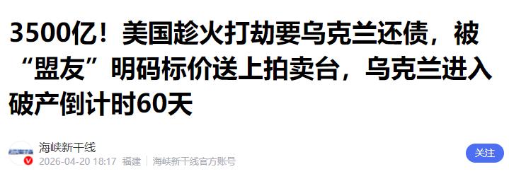 海峡新干线:3500亿!美国趁火打劫要乌克兰还债,被“盟友”明码标价送上拍卖台,乌克兰进入破产倒计时60天