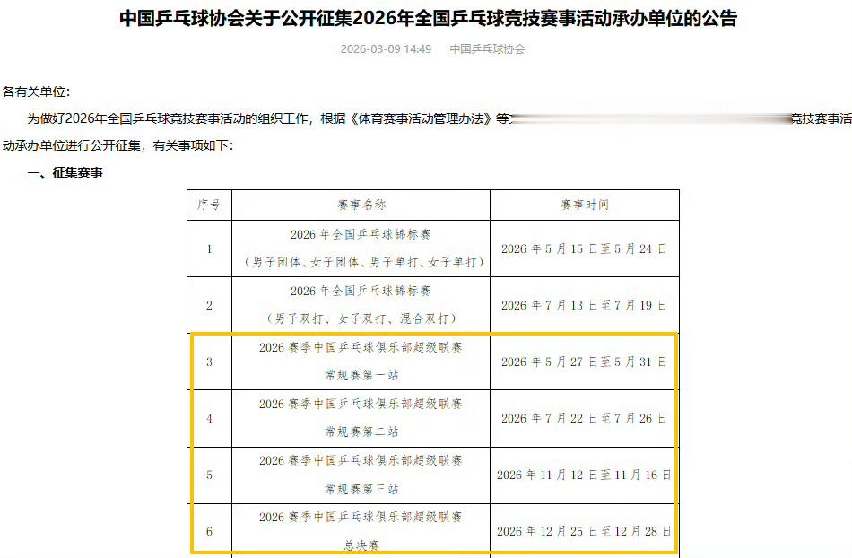 关于2026年乒超联赛唯一准确的公布信息就是中国乒协之前公布的今年比赛赛程时间安排。