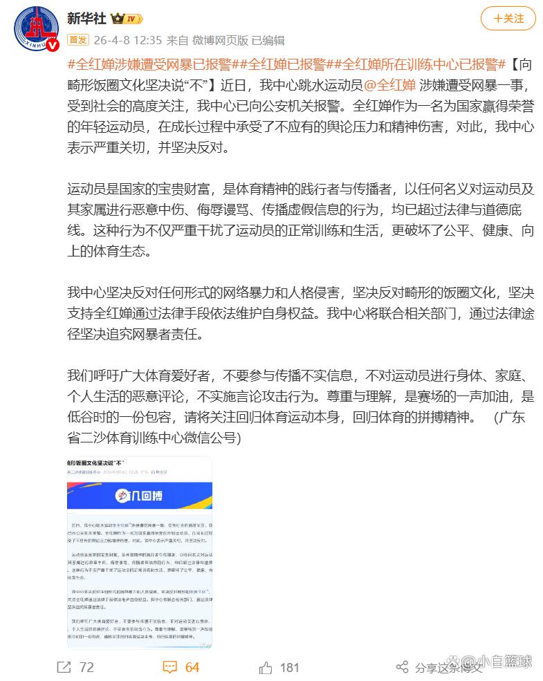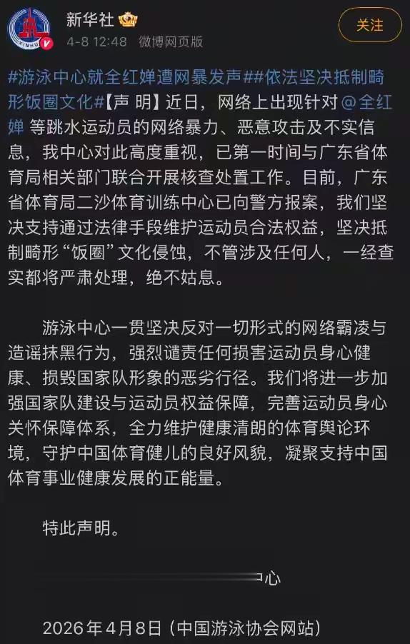 这份声明,分量极重。它不仅是为全红婵撑腰,更是向全社会传递一个信号:网络不是法外之地,恶意霸凌运动员的行为,必将受到法律的严惩;体育圈的恶意内耗、饭圈乱象,也必将被彻底整治。