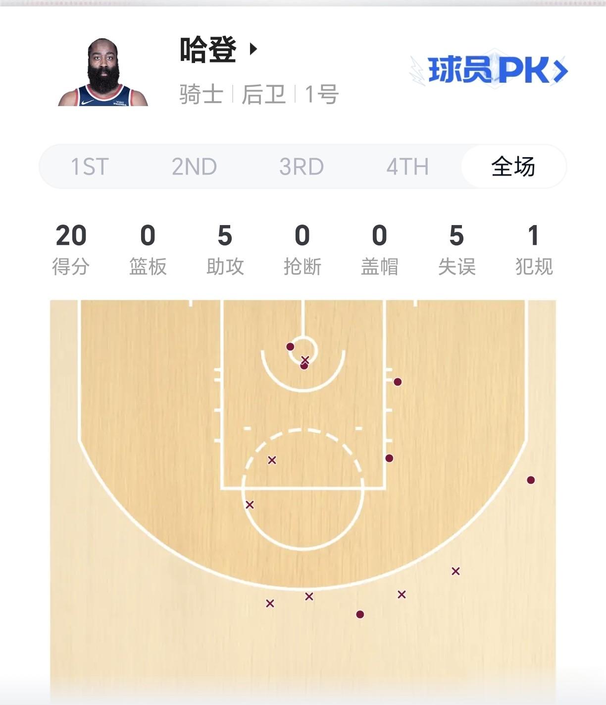 但是今天的哈登数据却有些辣眼睛:登场25分钟,出手13中6,三分6中2,拿到20分5助攻,正负值-34。