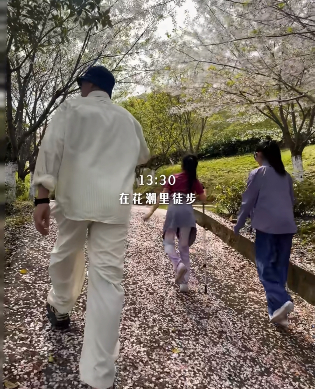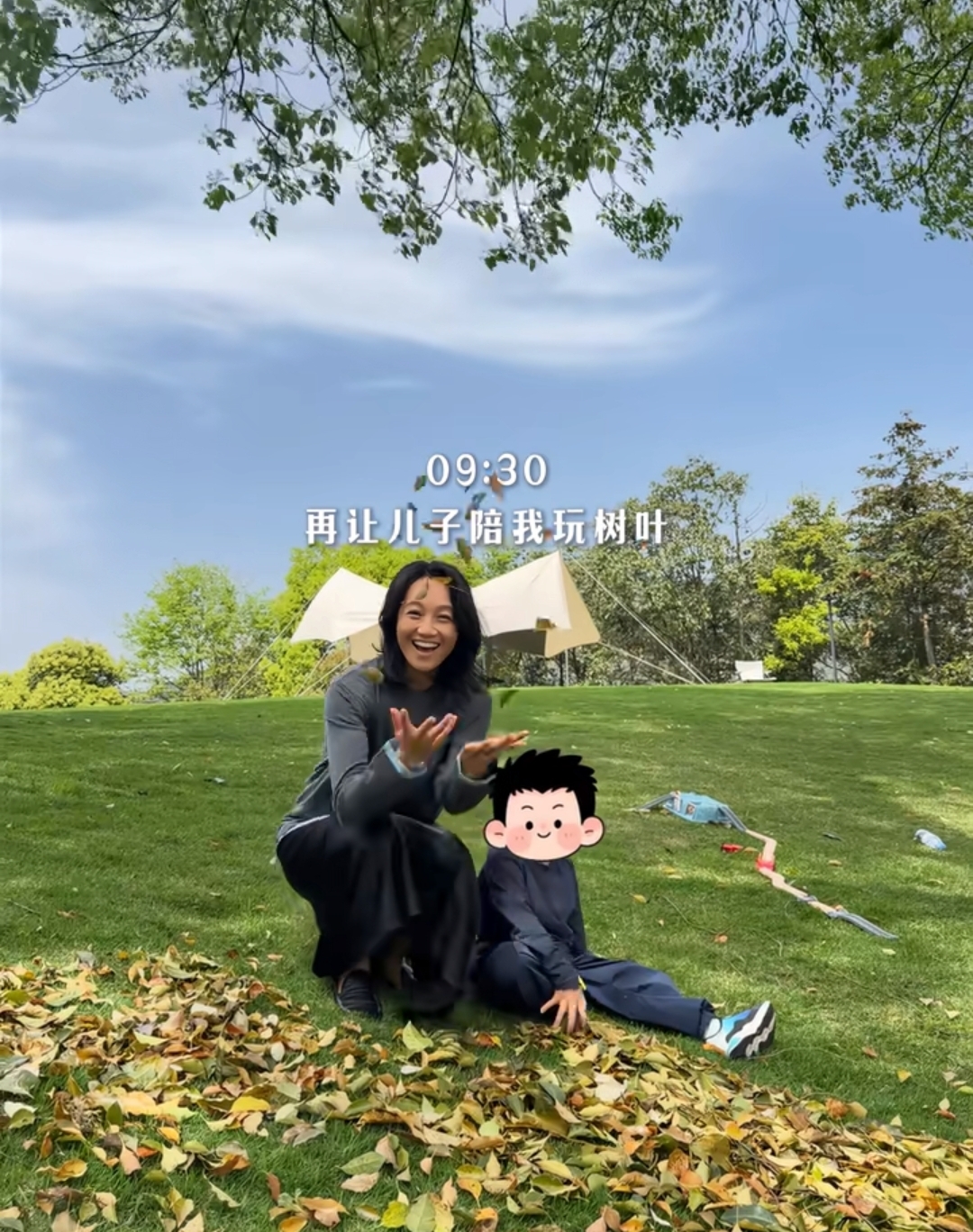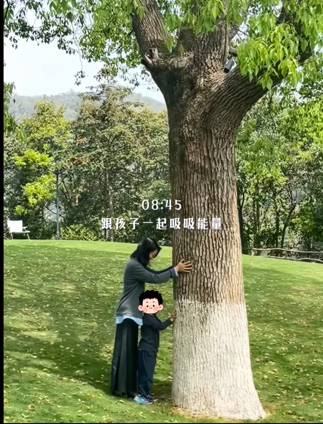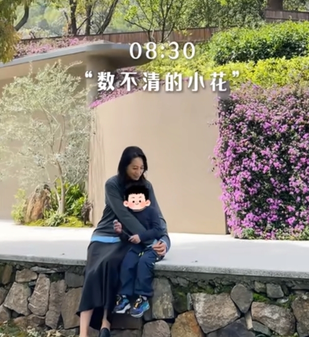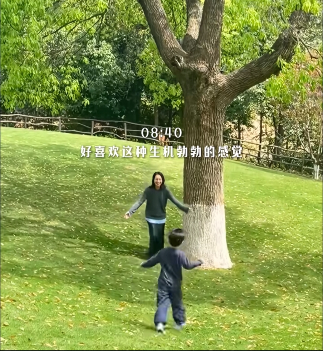 出门后,朱丹就带着五岁的儿子在草地上赏花,抱大树,看着是生机勃勃,加上朱丹和儿子一起玩的画面,整得很是治愈。