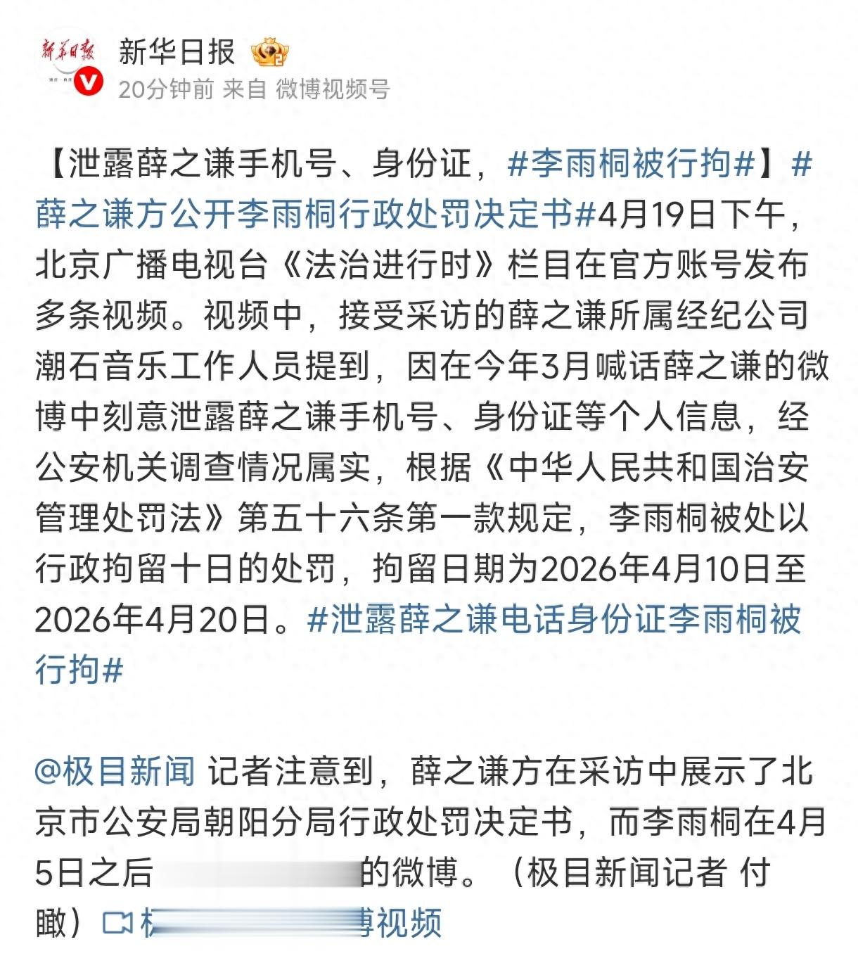 4月19日,北京朝阳警方通报,李雨桐因泄露薛之谦手机号、身份证等个人信息,被依法行政拘留十日,执行期4月10日至20日 。