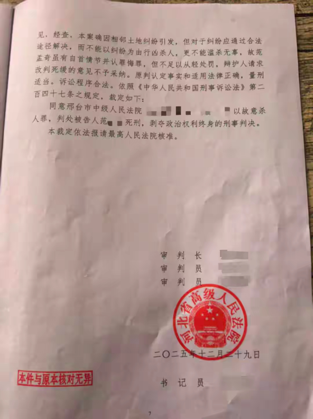 2025年12月29日,河北省高院裁定:同意邢台市中级人民法院以故意杀人罪,判处被告人范某死刑,剥夺政治权利终身的刑事判决。本裁定依法报请最高人民法院核准。