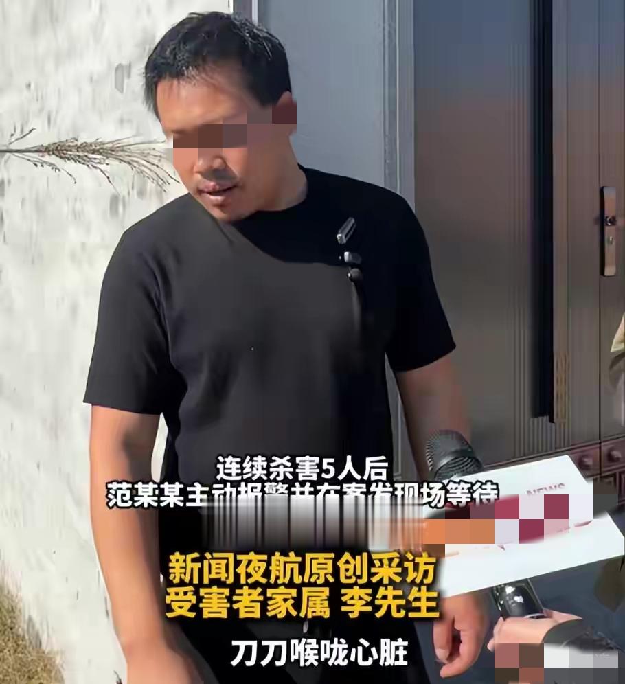 一家6口人被范某奇杀了5口,因为他知道李克在外地打工,所以就在原地拨打了110报警电话,等待警察把他抓获。