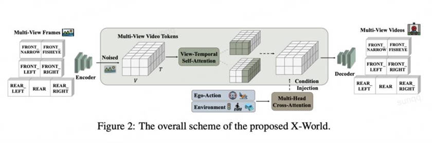 架构层面,X-World 基于当前领先的视频生成模型 WAN 2.2 构建,沿用其潜空间视频生成范式,将视频VAE与基于DiT的潜空间去噪器相结合。底层采用高压缩比 3D 因果自编码器(VAE),大幅降低计算与内存开销,支持长时序视频建模,从而更好地捕捉丰富的时空依赖关系,同时降低延迟、加快推理速度。模型骨干为定制化的DiT骨干网络,通过视角-时间自注意力机制,实现时间维度和视角维度的联合建模,从而确保7路摄像头视角间的一致性。X-World 还提供了一套全面的条件控制接口,包括自车动作、动态交通参与者、静态道路元素(如车道线、道路边界)、摄像头内外参,可对驾驶场景的生成过程进行细粒度调控。这些设计共同实现了多输入条件下的可控多视角生成。