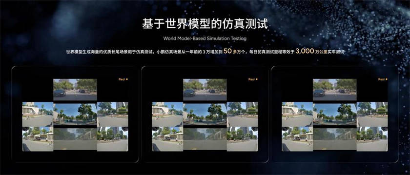 依托X-World,小鹏构建面向第二代VLA的闭环评估引擎。区别于传统的基于3D重建的技术路线,X-World可进行交互式推演,并支持对安全关键指标进行评估。例如,在 X-World 中运行第二代VLA,可在高度贴近真实世界视觉分布的虚拟环境中,评估碰撞率、目标达成进度、乘坐舒适性等性能指标。目前,小鹏自动驾驶仿真场景从一年前的3万增加到50多万个,每日仿真测试里程等效于3000万公里实车测试。
