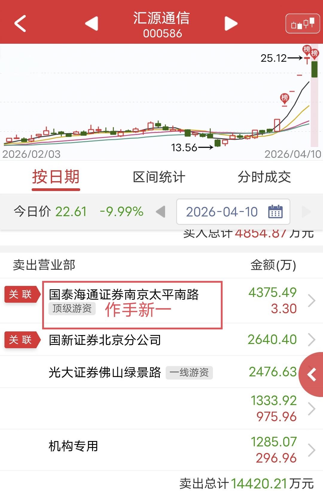 周五爆量连板的汇源通信,今天低开后直线摁跌停。盘后龙虎榜显示,作手新一卖出4375万,他是昨天打板买入的4867万,今天跌停止损走人的,这笔亏了近500万。