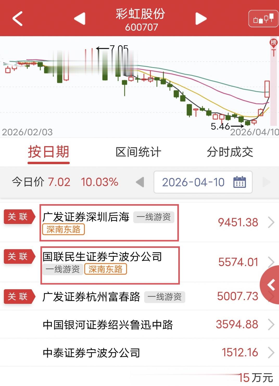 今天彩虹股份开盘快速涨停。盘后龙虎榜显示,深南东路两个账户双管齐下买入1.5亿。不过深南东路一家独大,且左侧有压力位,谨慎被砸。