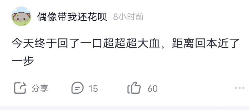周四花呗哥发文:今天终于回了一口超超超大血,距离回本近了一步。