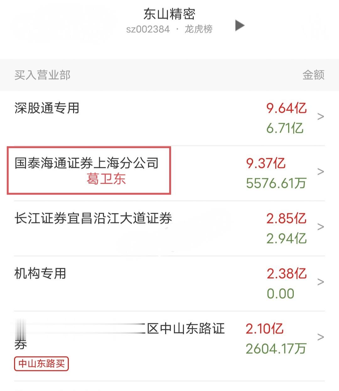 2、周三东山精密开盘快速涨停。盘后龙虎榜显示,葛卫东爆买9.37亿,卖出5500万,净买入8.8亿。也有说是章盟主买的,众说纷纭,不过这个席位葛卫东用的多点。