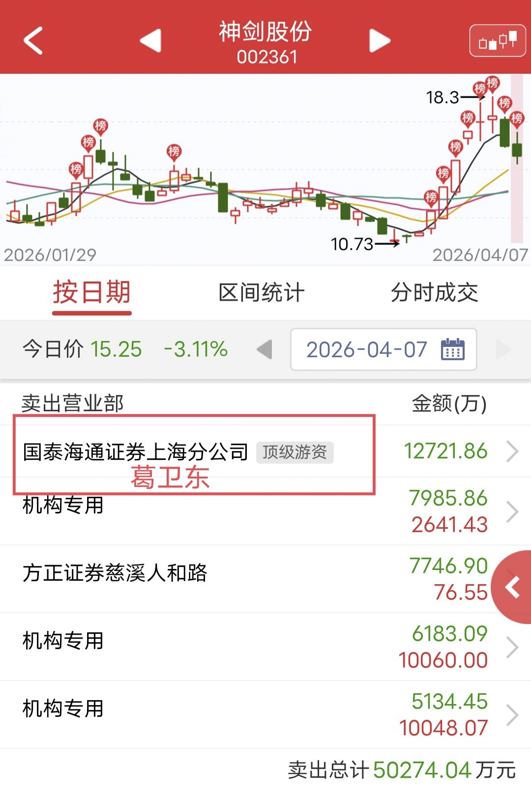 周一神剑股份继续下跌,盘中冲高回落。盘后龙虎榜显示葛卫东出货1.2亿。不知道葛老大什么时候就潜伏进去了,这波应该赚了不少!
