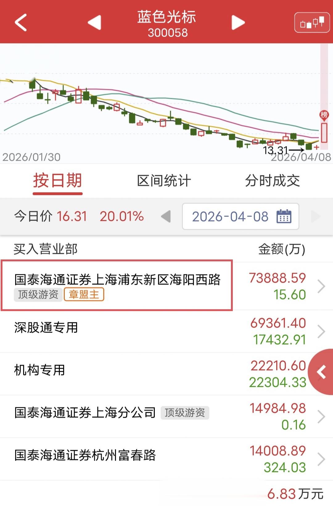2、周二蓝色光标20cm拉板。盘后龙虎榜显示,章盟主爆买7.38个亿,这种大手笔很久没见到了。