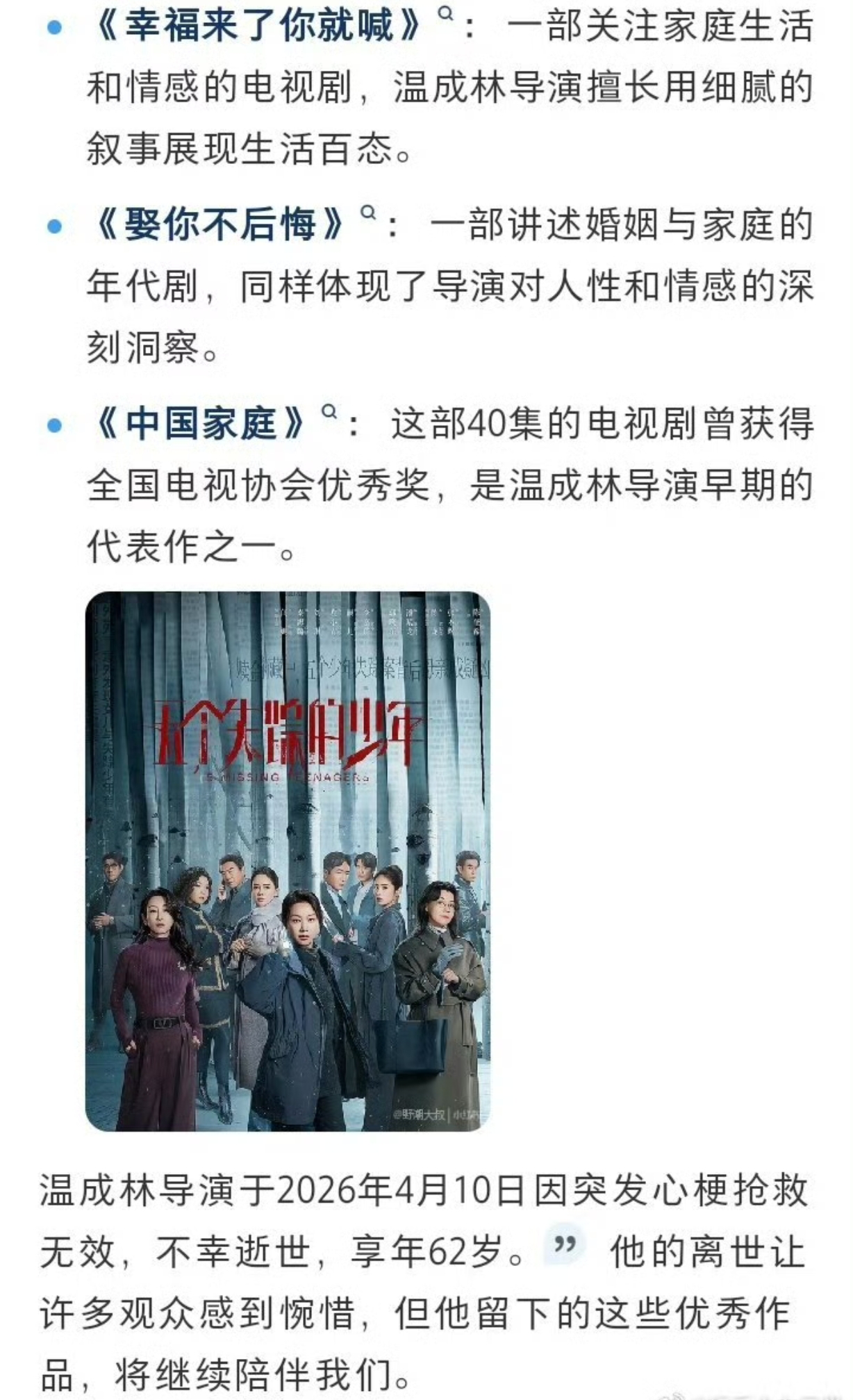 看到温成林导演突然离世的消息,心里特别不是滋味。62岁,正是经验最足、本该继续出好作品的年纪,却被心梗突然带走,实在太可惜。
