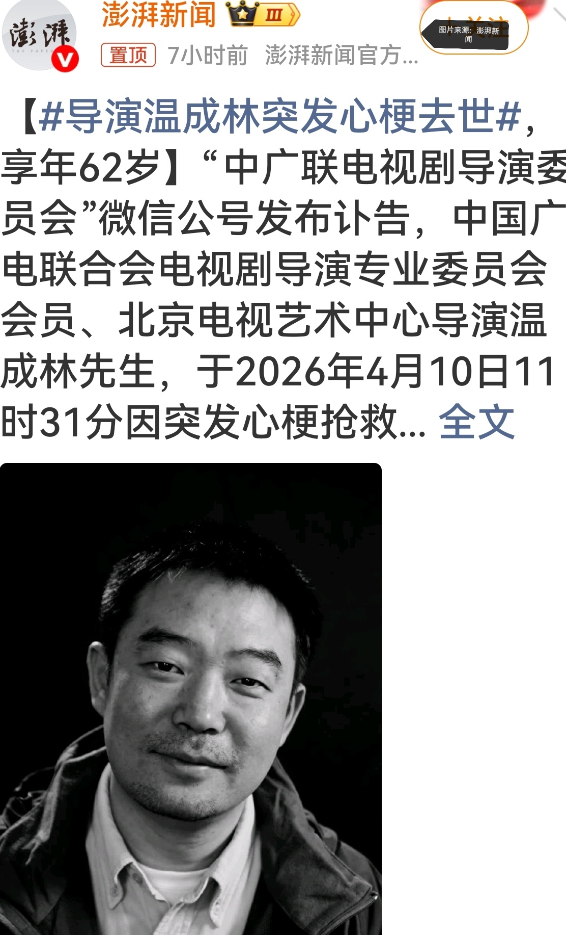 4月11日,中广联电视剧导演委员会发布讣告,知名导演温成林于4月10日上午11点31分,因突发心梗抢救无效离世,享年62岁 。