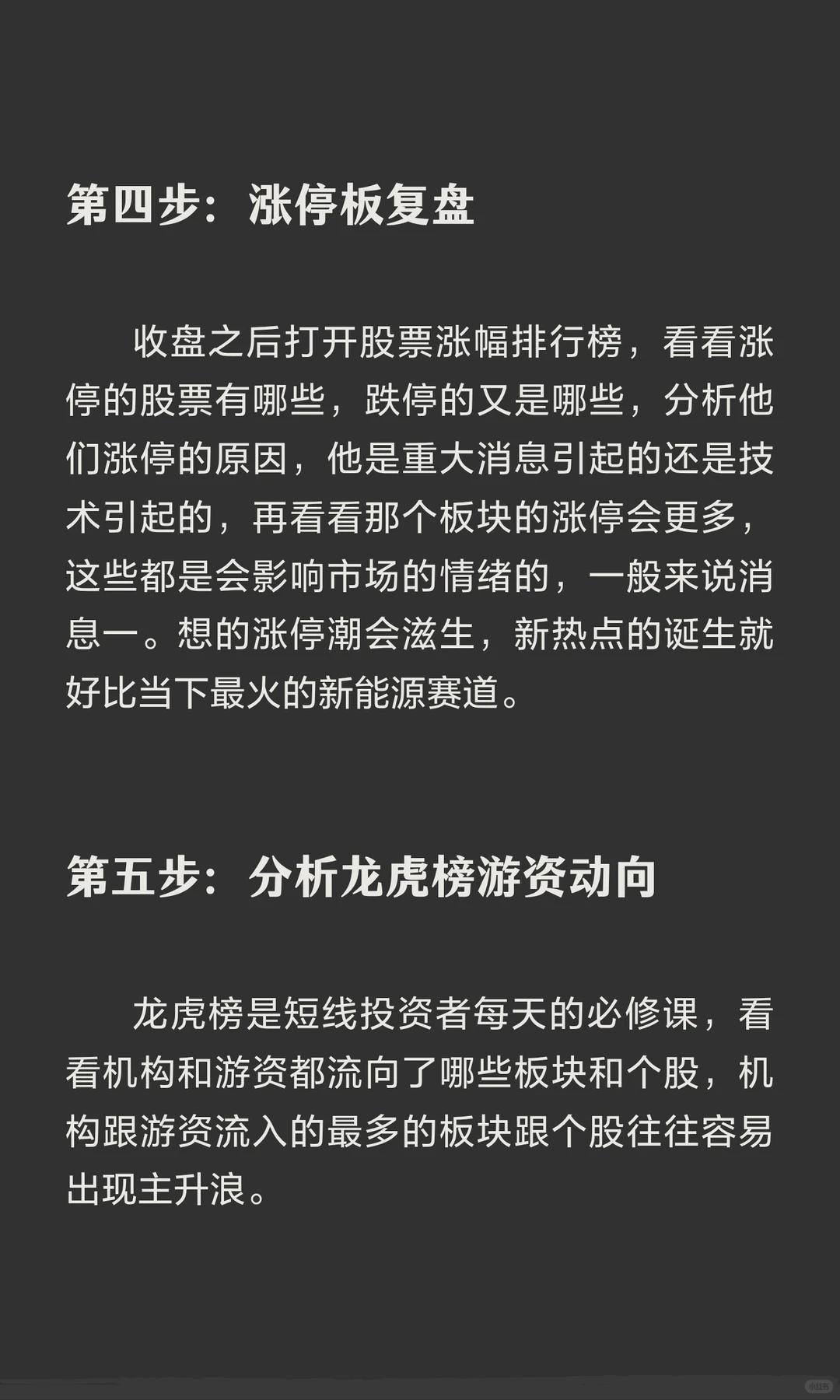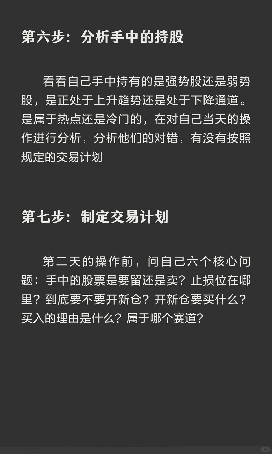 第六步,复盘自己的持仓。手里的票是强势还是弱势?在上升通道还是下降通道?今天有没有按计划操作?错了就认,别骗自己。