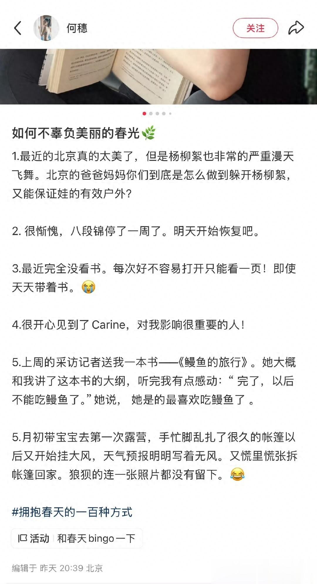 近日,何穗发布最新动态,询问网友带娃攻略:“柳絮天”如何既能躲开柳絮,又能保证娃的有效户外。她还说月初带宝宝去第一次露营,手忙脚乱扎了很久帐篷后起了大风,慌张拆帐篷回家,狼狈到一张照片都没留下。动态照片中,何穗还晒出了做面部提升针灸的图片。隔着屏幕看着都疼啊!