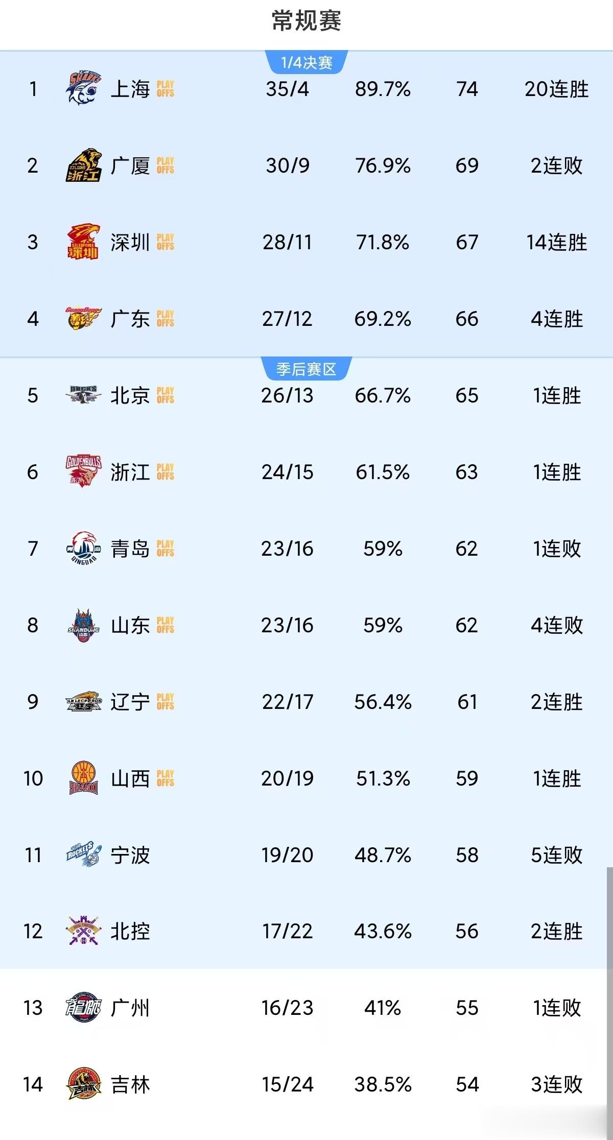 常规赛第39轮全部结束,目前前六格局彻底清晰,浙江24胜15负排名第六确定门槛,那就是胜率超过60%,并且拉开了跟后面球队差距。目前排名第一至六依次是:上海、广厦、深圳、广东、北京与浙江。
