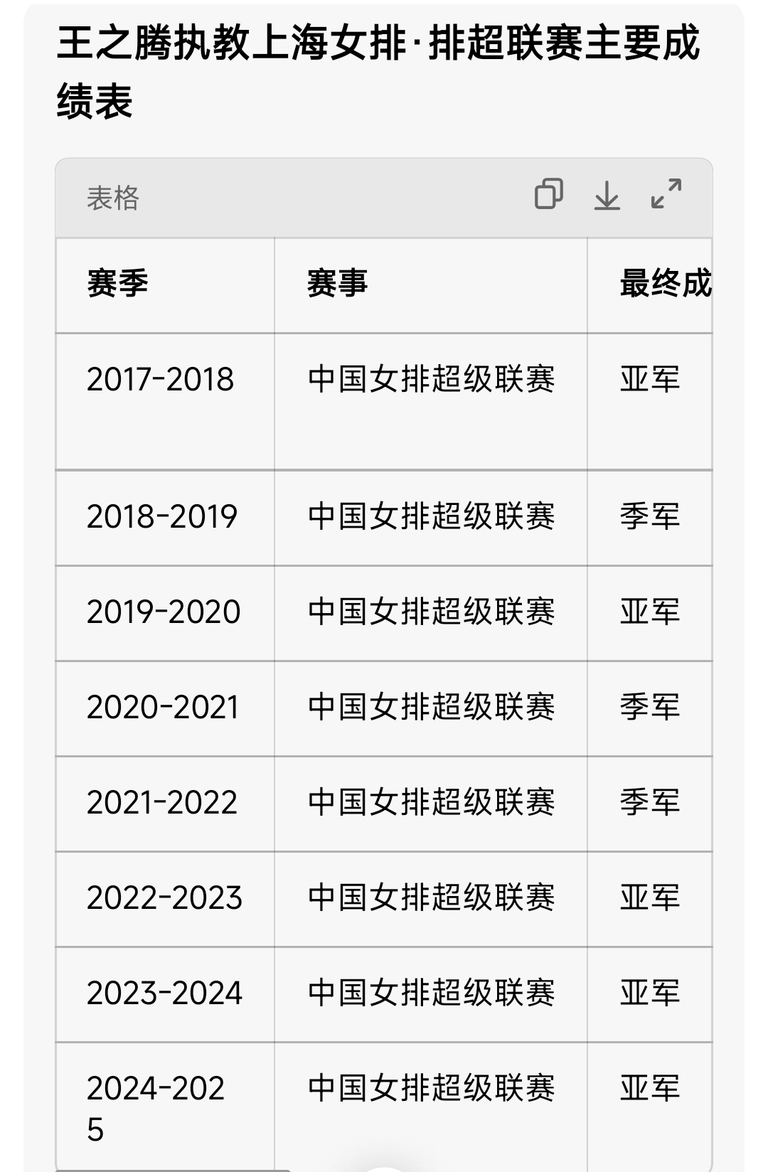 王之腾在执教上海女排主教练的八年时间,一共获得五次联赛亚军、三次联赛季军。上海女排在排超联赛获得成绩,是仅次于天津女排的最好球队了。