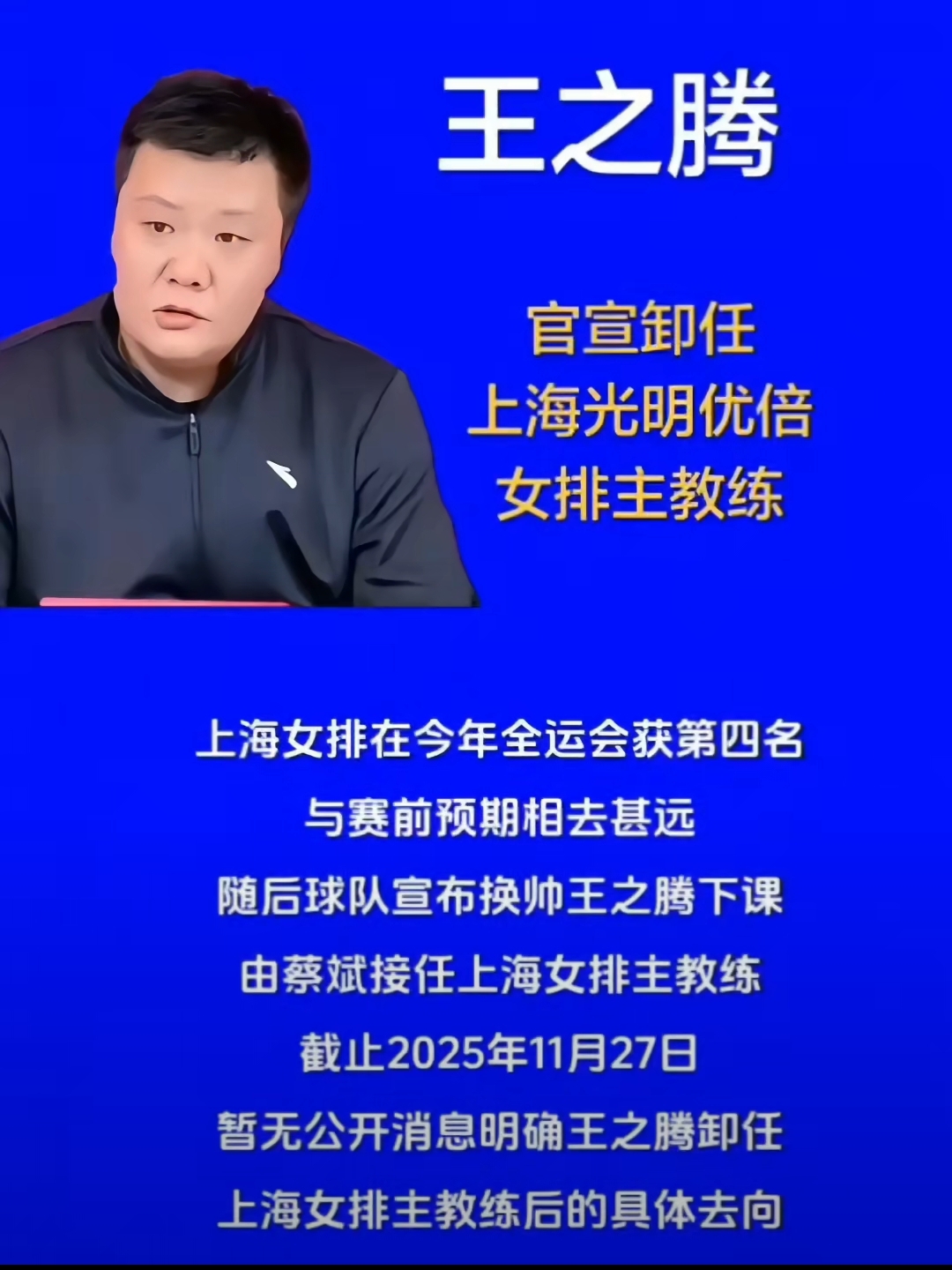 上海女排在全运会上仅仅获得第四名的成绩,王之腾的压力巨大。全运会结束后,王之腾积极的在做外援引进的工作。通过王之腾的努力,上海女排引进了俄罗斯主攻沃隆科娃和加拿大接应范赖克,让王之腾再次看到了夺取排超联赛冠军的希望。天有不测风云,2025年11月25日,上海女排突然官宣:王之腾下课,由蔡斌接任上海女排主教练。