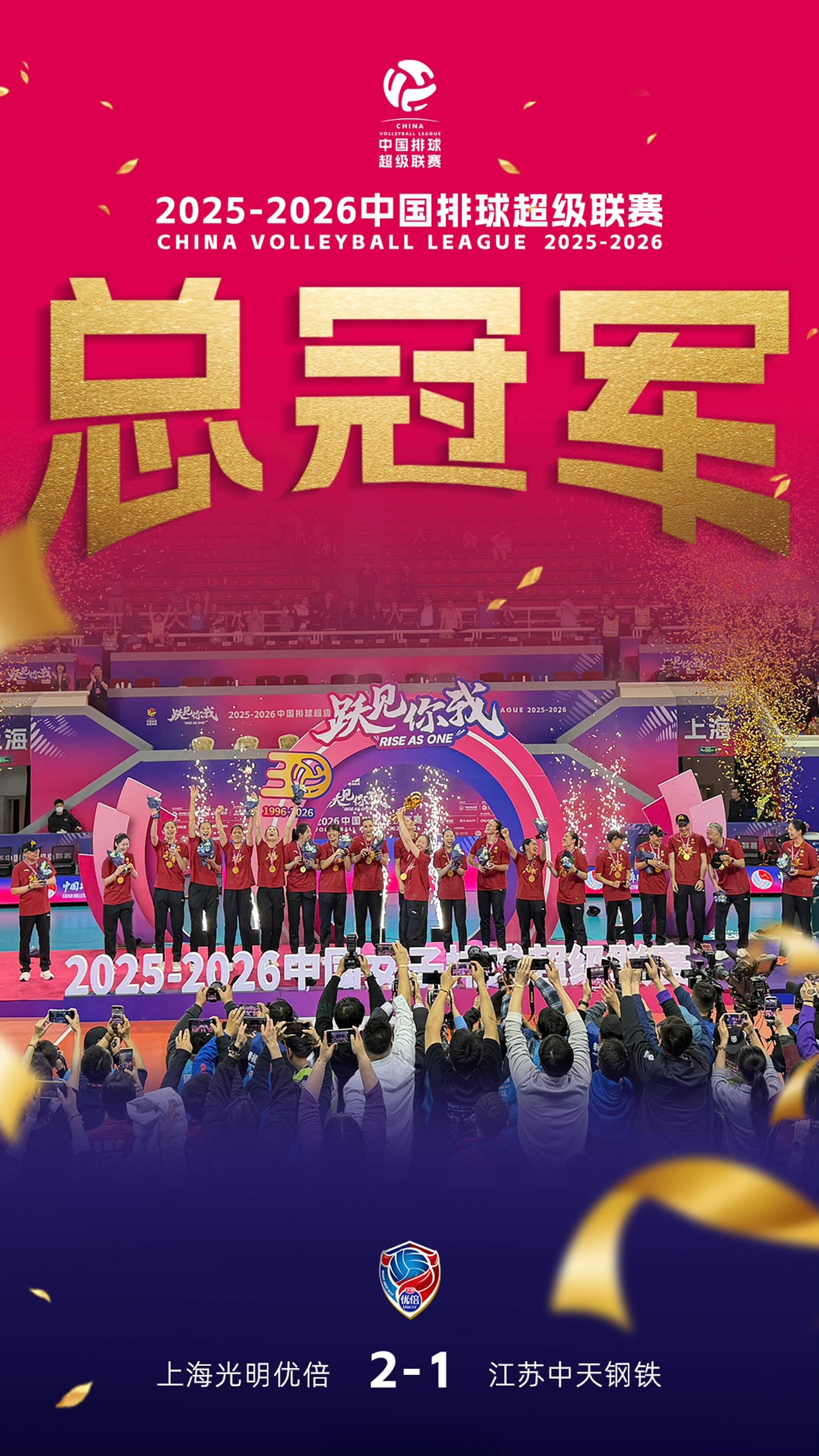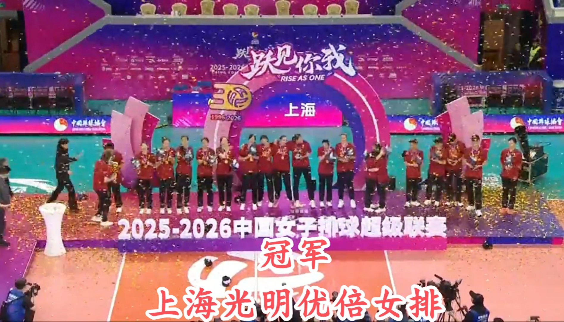 2025-2026赛季排超联赛联赛,经过三场比赛,最终上海女排以二比一战胜江苏女排,如愿获得排超联赛冠军。上海女排这个联赛冠军,是上海女排几代人共同奋斗的结果,也是上海女排时隔三十年,再次登上全国联赛最高领奖台。