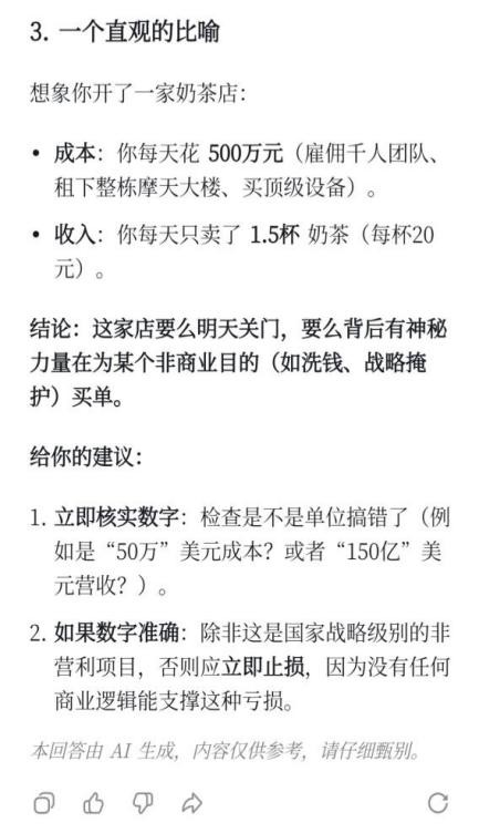 如何看待这种烧钱现象呢?为了尽量保持中立,我们有请Deepseek来当裁判,仅输入“一家公司每年成本50亿美元、营收150万美元,是什么水平?”Deepseek是这样回答的: