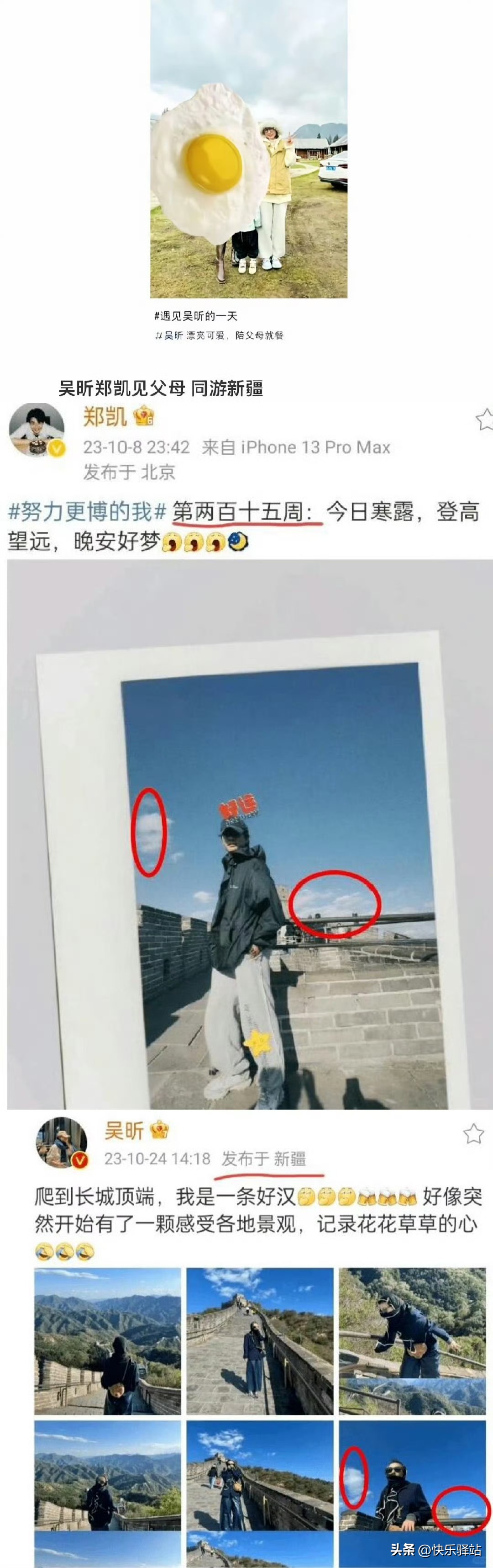 2023年7月及10月,吴昕在社交媒体晒出带父母在新疆阿勒泰等地旅游的照片;几乎同一时间段,郑凯也在微博发布了在同一地区(如阿勒泰、同款沙漠、夕阳场景)的游客照。两人发布的风景照角度、光线极其相似,被网友推断为“同一时间、同一地点拍摄”。