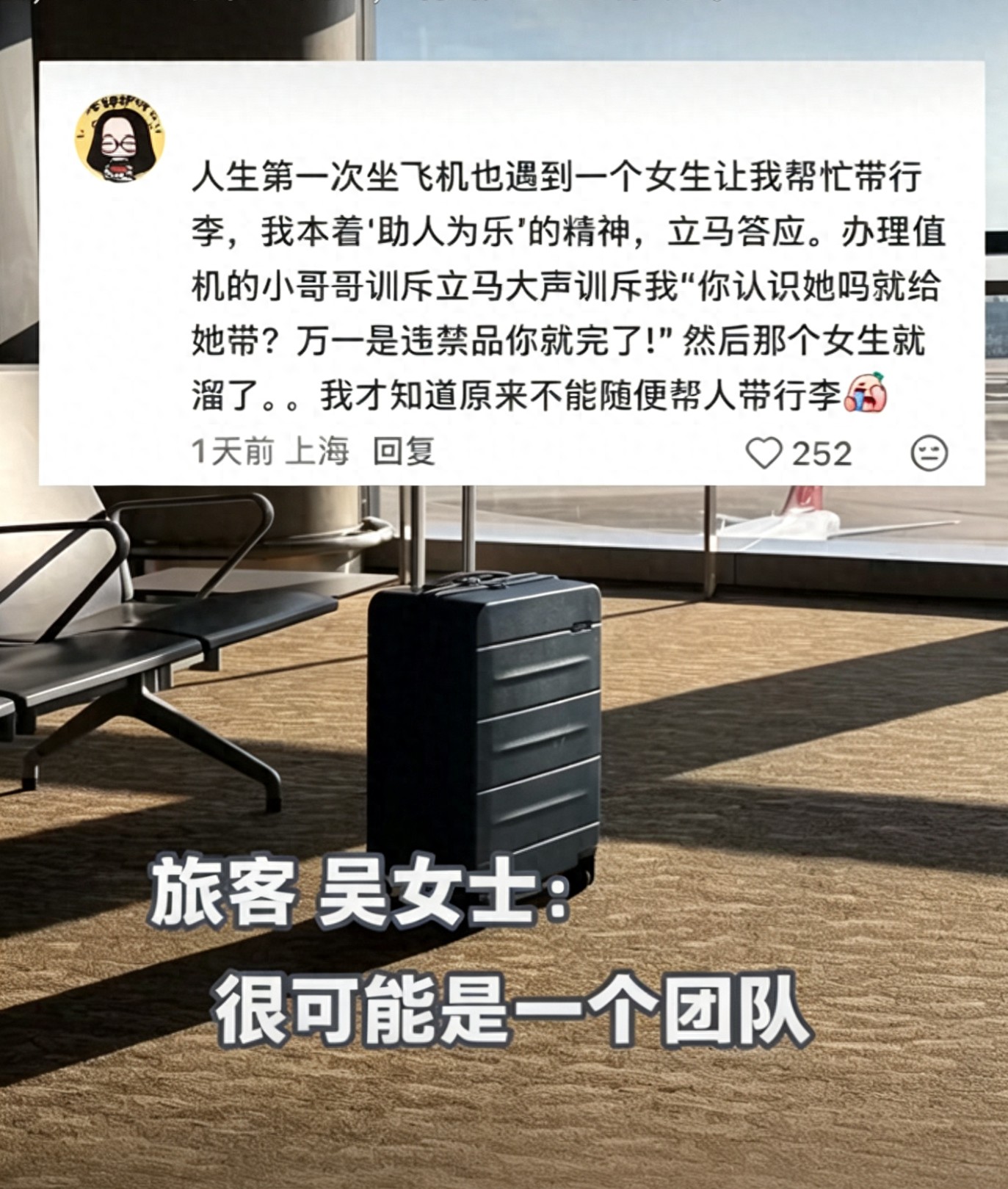 吴女士的经历也给所有人提了醒:真正的善良,不是盲目付出,而是懂得保护自己。当遇到陌生人请求帮忙带行李、看包裹时,无论对方说得多么可怜,都要果断拒绝;若对方纠缠不休,可寻求机场工作人员或警方帮助。正如网友所说:“吴女士的清醒,救了可能陷入困境的自己,也间接提醒了无数人避开陷阱。”