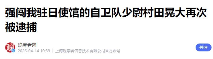 2026 年 4 月 14 日,东京警视厅以涉嫌违反《枪支刀具法》为由,对强闯中国驻日本大使馆的日本陆上自卫队三等陆尉村田晃大实施第二次逮捕。