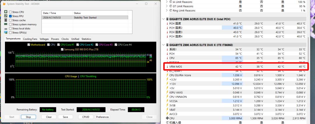 Ultra Turbo Mode运行稳定、VR MOS散热良好考虑到在Ultra Turbo Mode下酷睿Ultra 7 270K Plus会释放出更强的性能,对应的功耗与工作温度也达到这几种模式中的最高值。我们特别针对该模式下主板与处理器的满载稳定性,以及供电电路的温度控制能力展开专项测试。我们使用Cinebench 2026.1.0多核心渲染测试30分钟后,平台始终保持着稳定运行的状态,没有出现任何蓝屏、卡顿以及无响应等异常情况,顺利完成了全部测试流程,充分印证了技嘉Z890小雕DUO X主板供电系统的强悍实力。