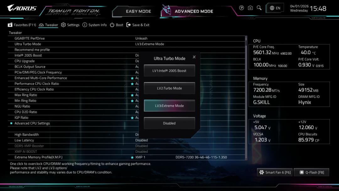 需要注意的是,Ultra Turbo Mode的性能提升幅度并非统一的,它会受处理器型号(如酷睿Ultra 7/9的不同规格、是否为Plus系列)、内存规格(频率、时序和颗粒体质)、散热条件及BIOS版本等多重因素影响。不同硬件配置下的提升幅度存在差异,主流游戏场景通常可获得5%~10%的帧率提升,极限跑分场景下最高可实现40%的性能提升。最后需要特别提醒,LV1 Intel 200S Boost Mode基于官方技术优化,不影响产品保修。而开启LV2 Turbo Mode/LV3 Extreme Mode,或手动调整频率、电压等高级参数,属于超频操作,可能影响产品保修政策,同时可能带来系统稳定性下降、硬件过热、安全性风险甚至缩短硬件使用寿命,建议用户在充分了解风险后,结合自身硬件条件谨慎使用。