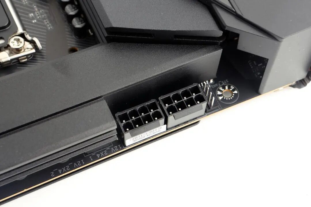 ▲主板电源接口为双8Pin,接针都基于实心结构设计,可提升电源效率,并更加坚固耐用。