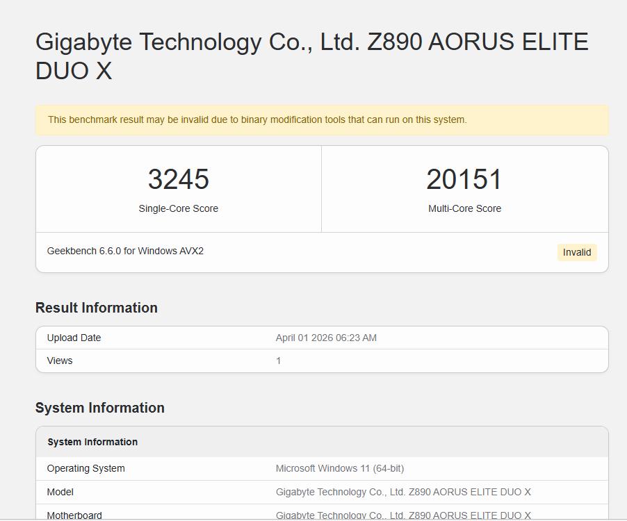 ▲全默认设置下的GeekBench 6单核心和多核心评分分别为3245分和20151分