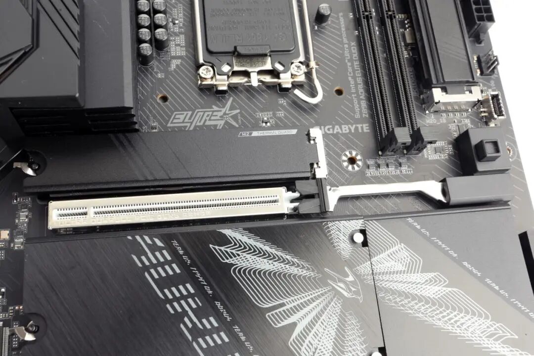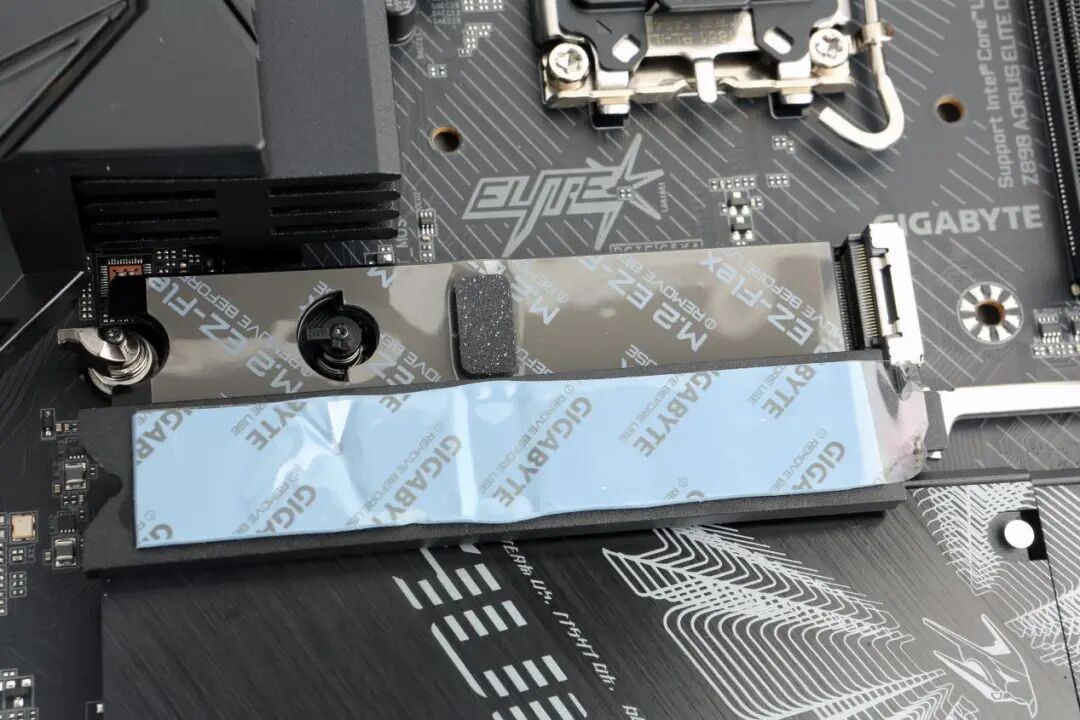 此外,这款主板的细节设计也尽显大厂风格,所有M.2硬盘位均搭载技嘉弹性背板,这一设计宛如为硬盘铺上了“席梦思”。它不仅能让硬盘与背板贴合更紧密,防止安装不当导致的物理形变与损坏,还能进一步提升散热传导效率与系统运行稳定性,有效延长硬盘的使用寿命与长期运行可靠性。