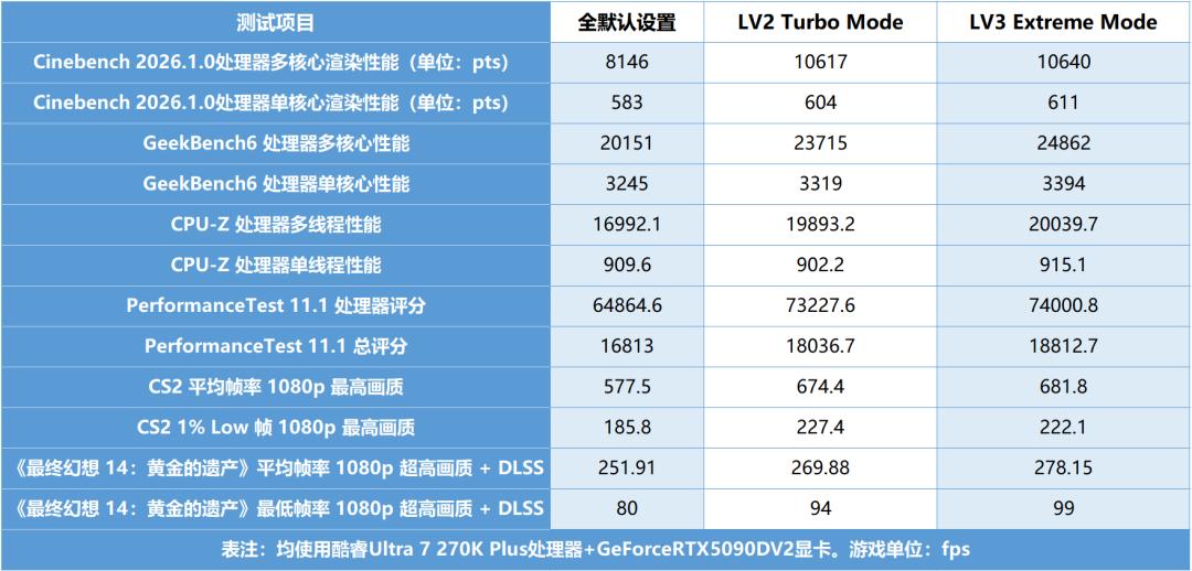 这样的性能提升同样体现在实际游戏场景中,实测显示,酷睿Ultra 7 270K Plus在LV3 Extreme Mode下,运行CS2与《最终幻想:黄金的遗产》两款游戏时,平均帧率、最低帧率及1% Low帧率均全面领先于全默认设置。