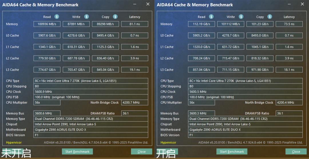 黑科技可让内存轻松超频至DDR5 9600性能提升近30%接下来,我们针对技嘉Z890小雕DUO X主板的内存性能进行了测试。该主板BIOS中内置了备受好评的“高频宽、低延迟”优化选项,在LV3 Extreme Mode下且未开启该功能时,我们选用的芝奇Trident Z5 RGB幻锋戟DDR5 7200 48GB套装,在AIDA64内存基准测试中的成绩为:读取带宽100936MB/s、写入带宽87891MB/s,内存延迟81.1ns。而开启“高频宽、低延迟”选项后,在完全无须手动调节内存延迟参数、也无须调整内存电压的前提下,内存性能实现了大幅提升——读取带宽直接达到112.19GB/s(112190MB/s),写入带宽突破至101112MB/s,内存延迟更是降至73.5ns。相比之下,读取带宽提升了11.2%,写入带宽提升了15%,延迟降低了9.4%,由此可见该功能的提升效果很明显。