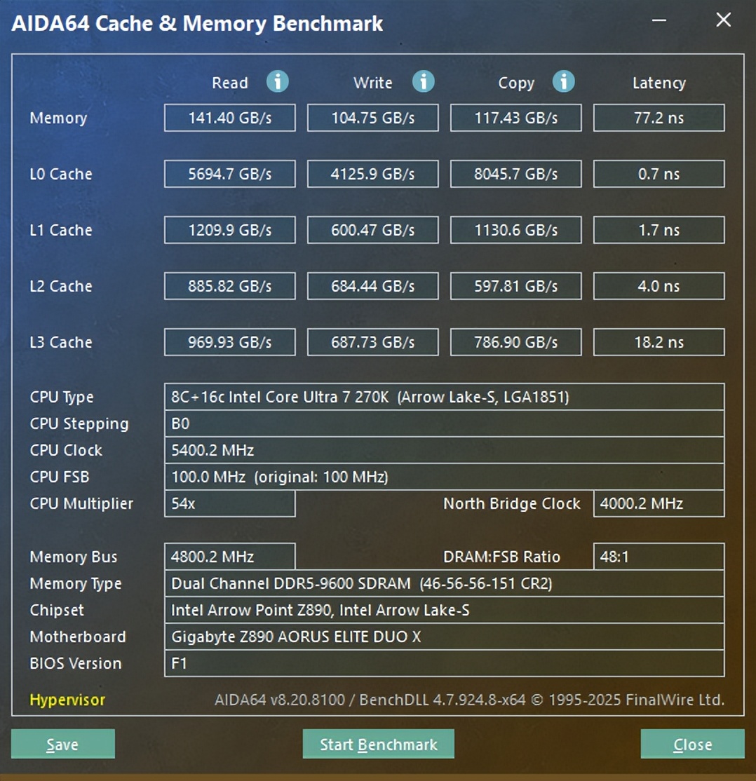 另外,如前文所述,技嘉Z890小雕DUO X采用了D5 Duo X技术,可让大容量内存工作在高频状态下。对此,我们对内存进行了超频测试。在77.2ns的延迟设定下,只需稍加电压就能让DDR5 7200内存工作在DDR5 9600超高频率下。同时,内存读写性能也得到大幅提升——读取带宽高达141.4GB/s,写入带宽达到104.75GB/s,与开启“高频宽、低延迟”后的性能相比,分别提升了26%和3.6%。