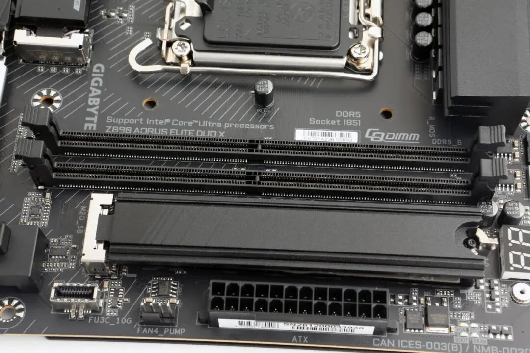 搭载技嘉主板专属的D5 Duo X内存技术最高支持DDR5 10266这款主板配备了两条内存插槽,有的读者可能会有疑问,如此高规格的主板怎么内存插槽比同级别主板少了两条?是不是偷工减料了?其实还真不是主板规格缩水了,这两条内存插槽可同时兼顾大容量(双通道最大256GB)和高频率(最高DDR5 10266),并且还搭载了技嘉主板专属的D5 Duo X内存技术。