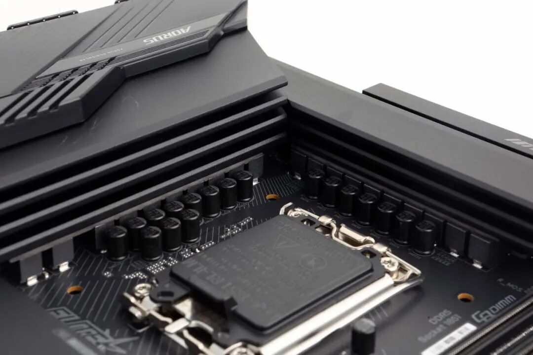 在散热设计上,技嘉Z890小雕DUO X同样用料扎实,非常注重温控表现。它配备大面积供电鳍片散热装甲,打造出散热面积扩容4倍的VRM散热模组,全面覆盖电感、SPS MOSFET等核心高热元器件,大幅提升热交换效率,确保供电区域在满负荷工况下依然保持低温稳定。每块散热片下方均铺设导热系数达5 W/m·K的高效导热垫,让电感、MOSFET与散热器无缝贴合,实现热量的快速导出与分散。主散热模组还采用多剖沟设计,预留多重气流通道与出入口,确保气流顺畅穿行,进一步强化散热效能。为进一步提升散热表现并加固主板结构,主板搭载全覆盖式PCB金属背板——它不仅辅助提升了整体散热效率,更强化了PCB板的结构稳固性,有效避免长期高负载使用导致的板材变形,保障系统长期运行的稳定性。