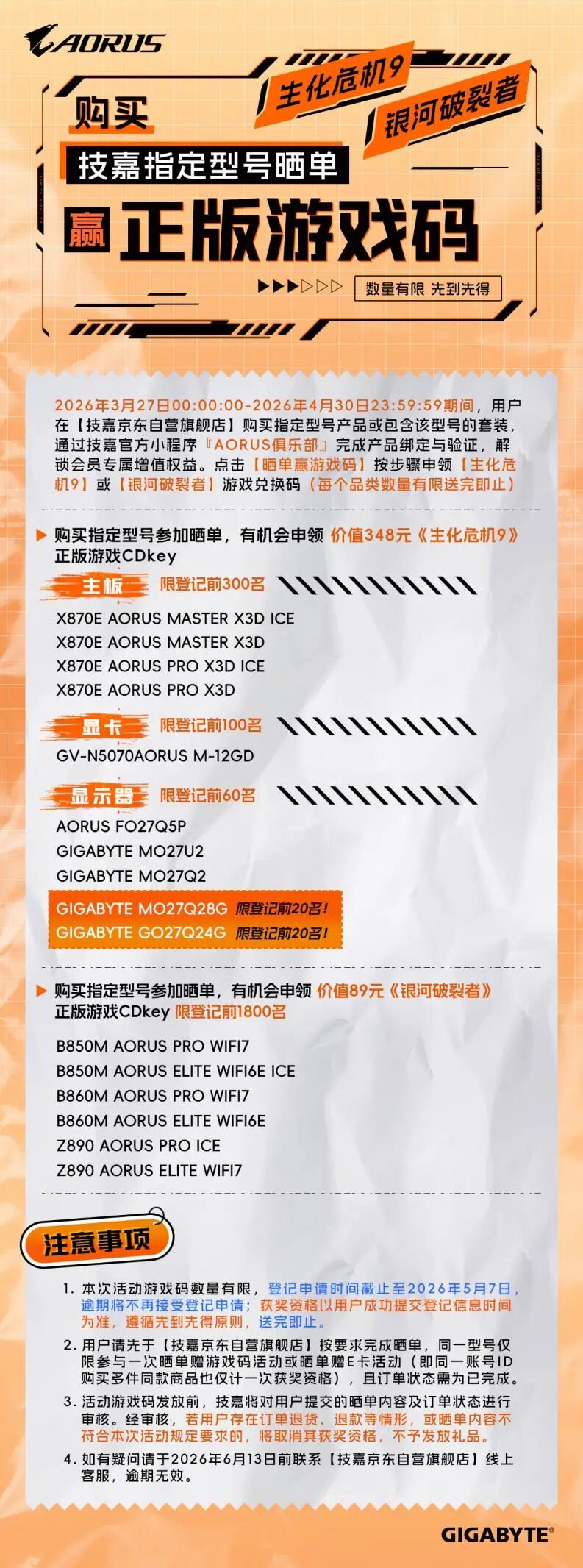 更有惊喜限时活动等你来参与!在 2026 年 3 月 27 日 00:00 至 4 月 30 日 23:59 期间,凡在【技嘉京东自营旗舰店】购买指定型号产品或对应套装,通过技嘉官方小程序「AORUS 俱乐部」完成产品绑定与验证,即可解锁会员专属增值权益。按照指引点击【晒单赢游戏码】完成申领,即可获得《生化危机 9》或《银河破裂者》游戏兑换码!数量有限,先到先得