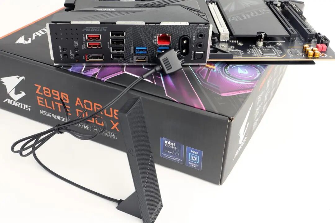 网络连接上,主板板载了瑞昱5GbE有线网卡,低延迟特性适配游戏与高速传输场景。另外,其I/O背板的Wi-Fi 7天线接口采用技嘉特有快易拆设计,无须拧螺丝,插拔式安装几秒即可完成。主板的无线模块搭载英特尔BE200NGW Wi-Fi 7芯片,支持蓝牙5.4,兼容320MHz信道、4K-QAM技术,可灵活分配2.4GHz(流媒体)与5/6GHz(游戏)频段,实现低中断、高品质网络体验,最大理论传输带宽达5.8Gb/s。包装盒内附带有Wi-Fi 7高增益天线,集成智能天线功能与磁性底座,既能增强信号强度,又可轻松固定在机箱上,进一步提升无线使用体验。