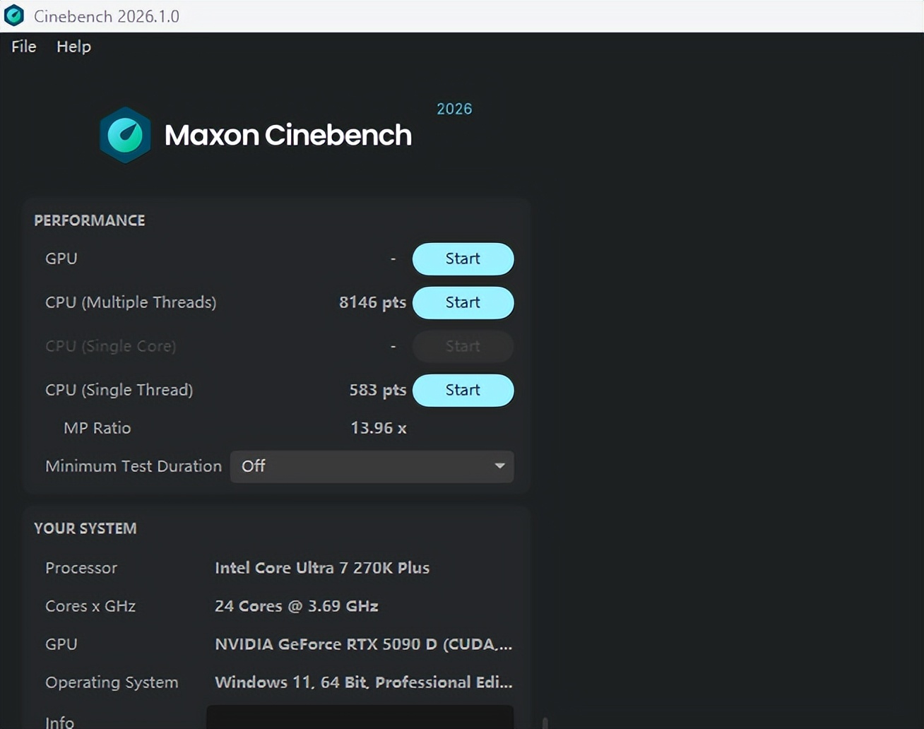 ▲在全默认模式下,Cinebench 2026.1.0多核心和单核心渲染成绩分别为8146pts和583pts。