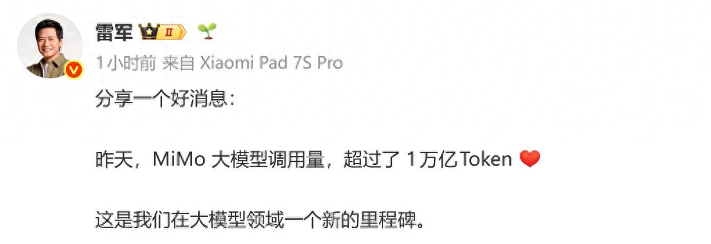 雷军宣布小米MiMo大模型调用量超过1万亿Token