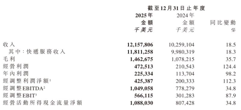 2025年,极兔彻底走出亏损阴影,年内利润达到2.25亿美元,同比增幅达98.2%,经调整净利润为4.25亿美元,同比大增112.3%。净利润翻倍,代表其盈利能力大幅提升。同时,极兔规模效应显现,全年全球包裹量突破301.3亿件,相当于日均8250万件,同比增长22.2%,总收入达到121.6亿美元,同比增长18.5%。而量增速>收入增速,可见单位成本持续下降。