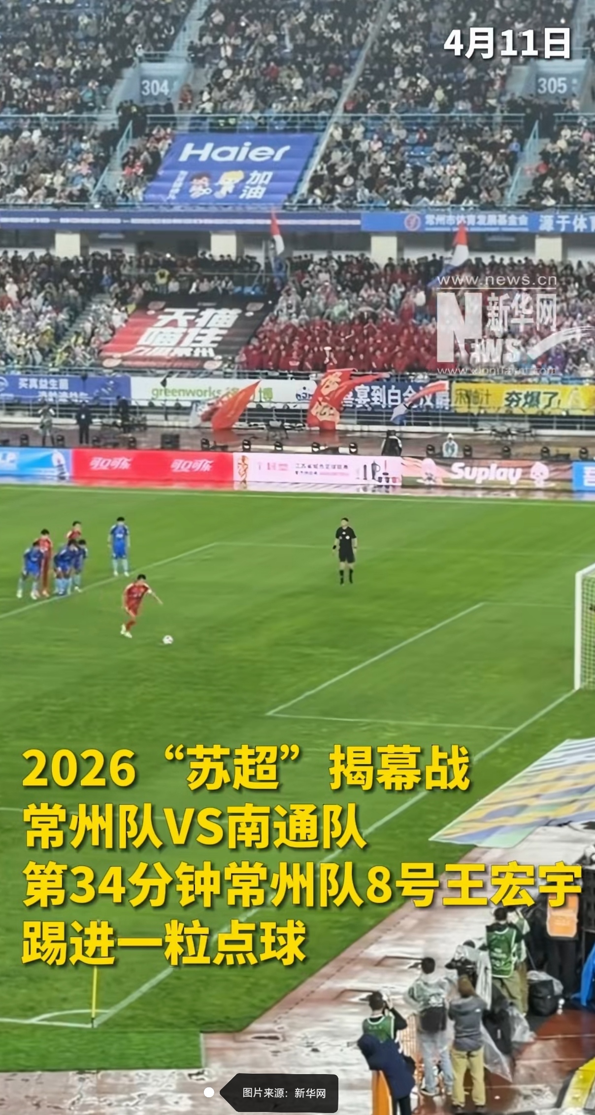 4月11日晚,2026赛季苏超揭幕战在常州打响,常州队主场迎战南通队。比赛第34分钟,常州队获得点球机会,队长王宏宇站在12码前,稳稳将球罚进,为球队打进新赛季首球。进球后的他没有疯狂庆祝,而是掩面跪地,情绪彻底崩溃。赛后采访中,王宏宇几度哽咽,说出了让无数人破防的话:“这个进球献给我父亲,他上个月刚走,我觉得他能看见就很好了。”