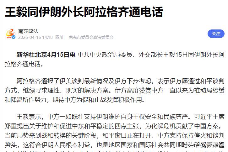 伊朗外长连夜急电中国美国的狠话刚说完,反转就来了,真的快到我都没反应过来,4月16号凌晨,距离贝森特放话还不到24小时。