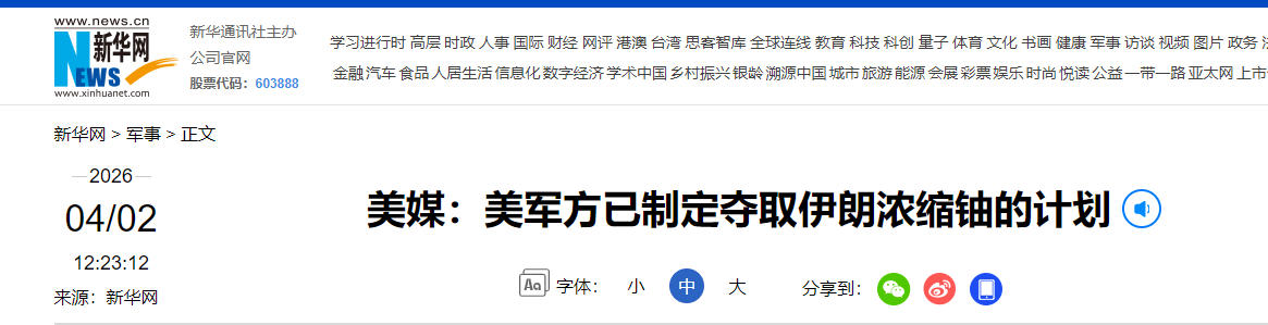 美媒:美军方已制定夺取伊朗浓缩铀的计划 2026 04/02 12:23:12 来源:新华网