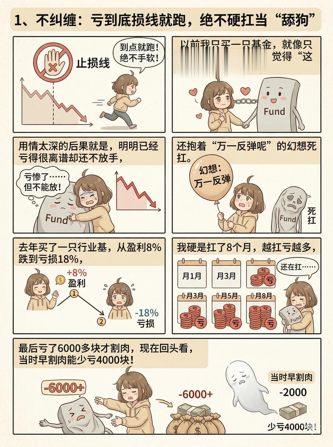 以前亏了18%还幻想反弹,最后多亏6000块。现在我给每只基定死线:偏股基15%止损、行业基20%止损、纯债5%止损。今年3月一只科技基跌到16%,我立马清仓,它后来又跌了12%,我直接避开4000多亏损。止损不是认怂,是保命。