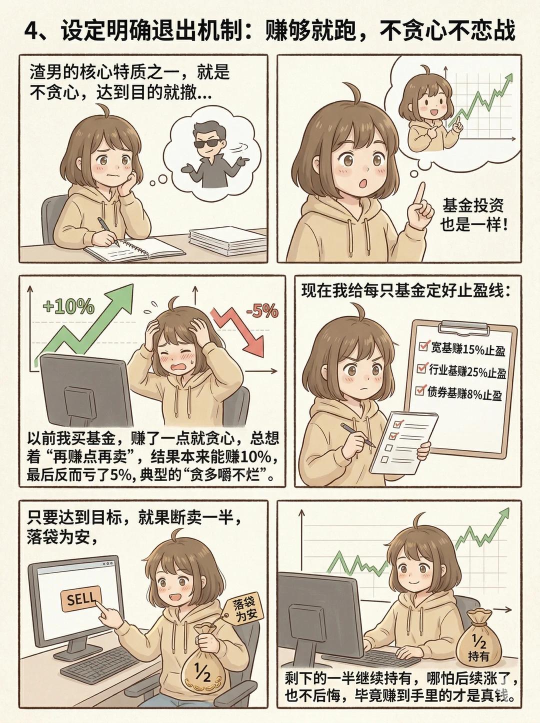 以前赚了12%没卖,最后跌回原点。现在定好止盈线:宽基15%、行业基25%、债券8%,达到目标就卖一半锁定收益。2月份一只宽基涨到15%,我止盈一半赚了3200块,剩下一半后来跌了4%也不慌。