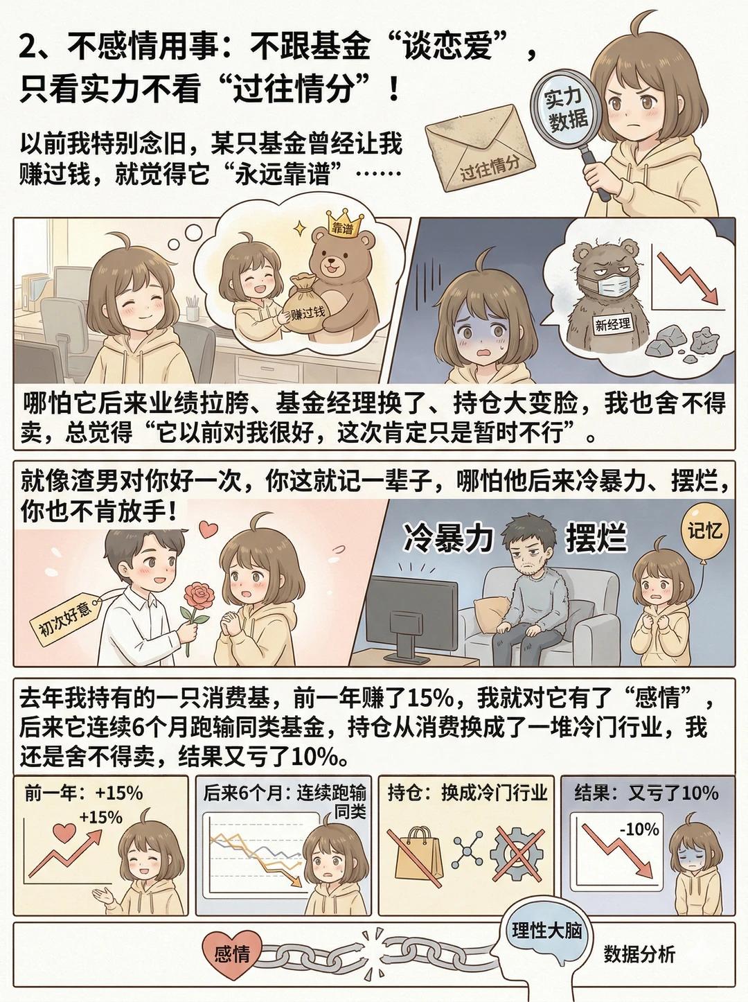 曾经一只消费基让我赚过15%,我就觉得它永远靠谱。后来换了经理、持仓变脸,我还舍不得卖,又亏10%。现在只要业绩连续3个月跑输同类、经理离职、风格漂移,直接抛弃。上半年清掉两只“旧爱”,换宽基+债券,3个月赚了7%。